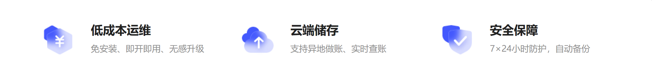 助力小微企业搭建云端财务管理系统,免安装、即开即用、无感升级,支持异地做账、实时查账,7×24小时防护,自动备份。